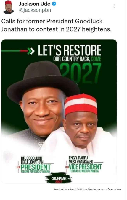 The poster, posted by journalist Jackson Ude on Twitter, presents Jonathan as the presidential candidate, with former Kano State Governor Rabiu Kwankwaso as his vice-presidential choice.